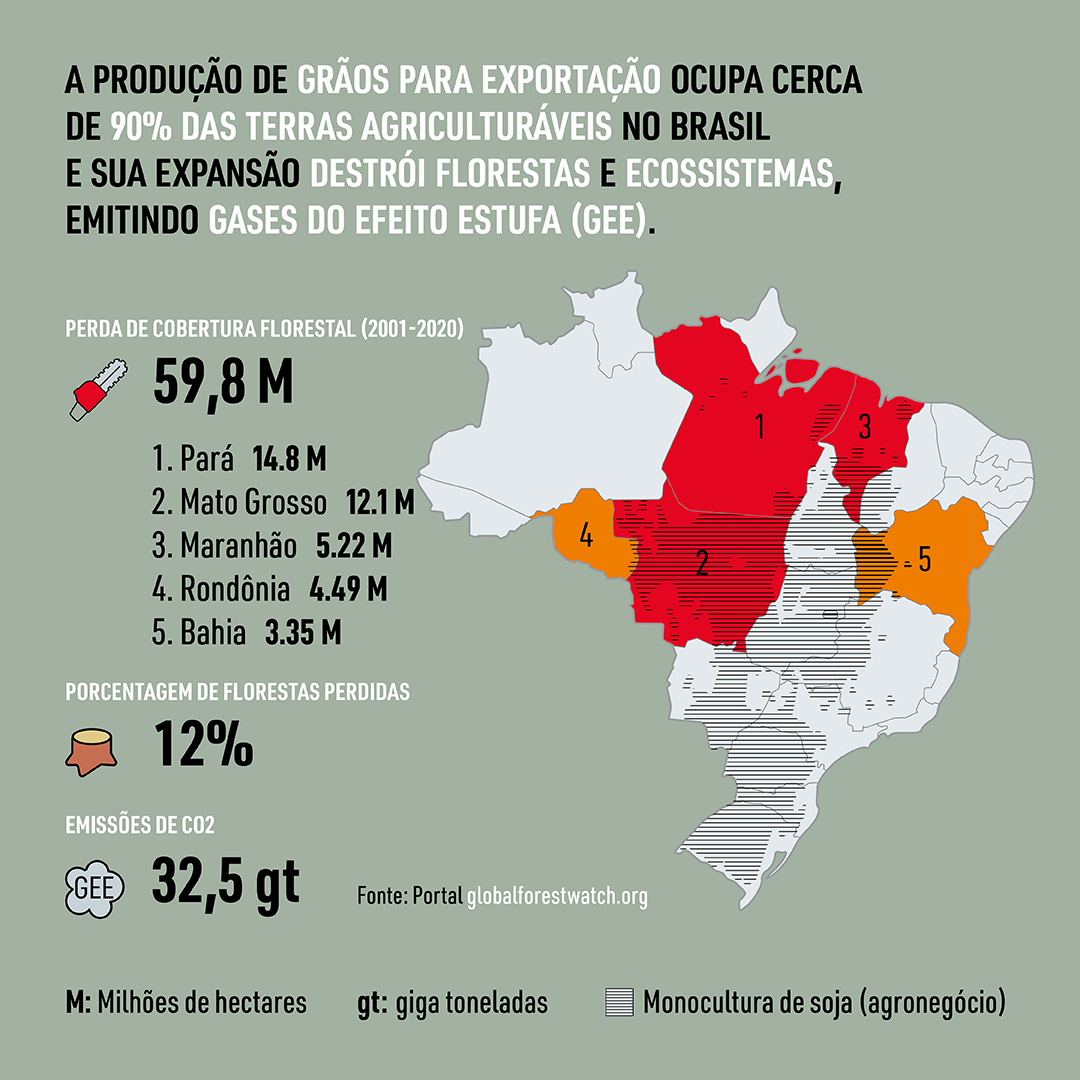 A produção de grãos para exportação ocupa cerca de 90% das terras agriculturáveis no Brasil e sua expansão destrói florestas e ecossistemas, emitindo gases do efeito estufa.