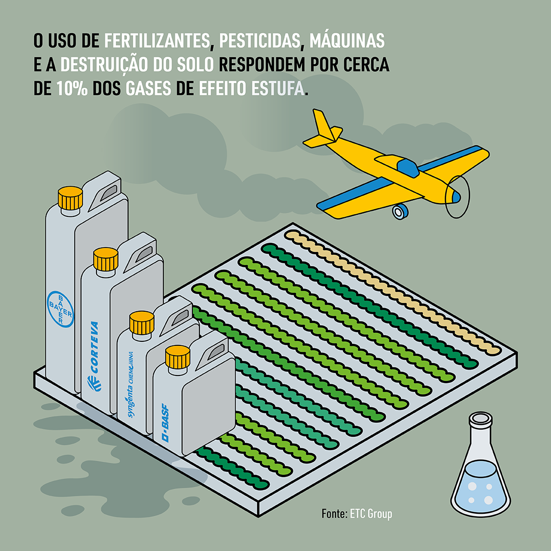 O uso de fertilizantes, pesticidas, máquinas e a destruição do solo respondem por cerca de 10% dos gases de efeito estufa.