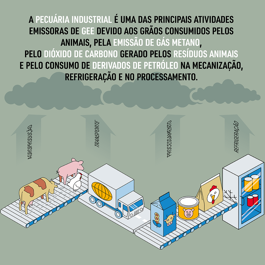 A pecuária industrial é uma das principais atividades emissoras de GEE devido aos grãos consumidos pelos animais, pela emissão de gás metano que gera, pelo dióxido de carbono gerado pelos resíduos animais e pelo consumo de derivados de petróleo na mecanização, refrigeração e no processamento.